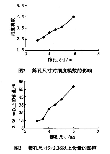 瑞昌機械生產(chǎn) 砂石生產(chǎn)線的結(jié)合兩種類型破碎方式的特點,采用反擊式與沖擊式破碎相結(jié)合的破碎方式,從而獲得粒型、級配較好機制砂。 控制機制砂產(chǎn)品級配的另一個重要因素就是篩分環(huán)節(jié),其中振動篩的篩孔形狀、尺寸以及篩面傾角大小是影響機制砂質(zhì)量的關(guān)鍵性參數(shù);機制砂生產(chǎn)過程中有較大含量的石粉顆粒,且對級配要求較高,一般都采用正方形方孔篩,不宜選用長方形和圓形篩孔。為使物料達到良好的篩分效果和處理量,根據(jù)振動篩廠家的經(jīng)驗,篩面的傾角一般控制在20。左右為宜。振動篩的篩孔尺寸直接影響著機制砂的細度模數(shù)、級配以及石粉含量。如圖2和圖3所示:篩孔尺寸越大,機制砂的細度模數(shù)越大,級配中2.36以上的顆粒含量也隨著增加,根據(jù)實驗結(jié)果,篩孔的實際尺寸控制在3.5~4.5之間,機制砂的顆粒級配、石粉含量以及細度模數(shù)可以滿足生產(chǎn)要求。在忻阜高速機制砂實際生產(chǎn)過程中,振動篩的篩孔尺寸為3.8rnm,經(jīng)篩分后,所得機制砂級配中2.36以上的含量在13.6%~14.8%之間,機制砂的顆粒級配如圖所示,級配合理能夠滿足實際工程的需要。